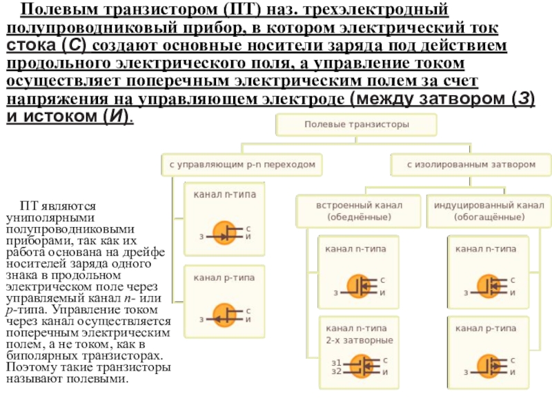 ПТ являются униполярными полупроводниковыми приборами, так как их работа основана на дрейфе носителей заряда одного знака в продольном электрическом поле через управляемый канал п- или р-типа. Управление током через канал осуществляется поперечным электрическим полем, а не током, как в биполярных транзисторах. Поэтому такие транзисторы называют полевыми.