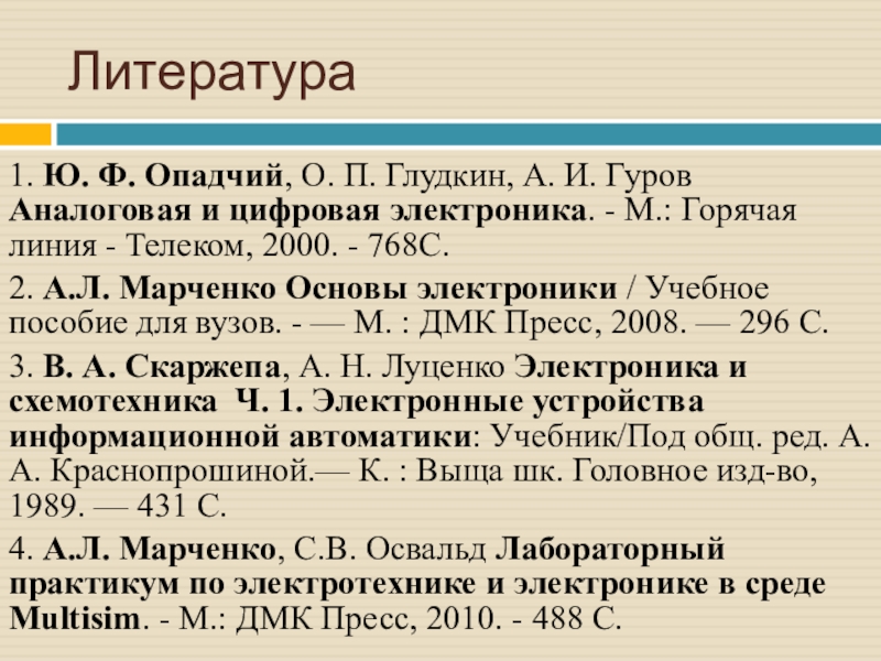 2. А.Л. Марченко Основы электроники / Учебное пособие для вузов. - — М. : ДМК Пресс, 2008. — 296 С.