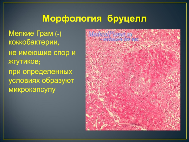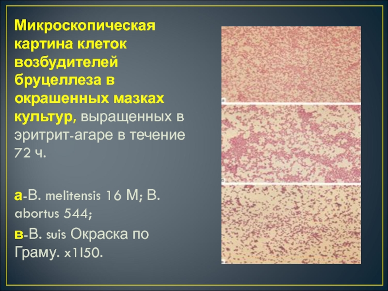 Слайд 7Микроскопическая картина клеток возбудителей бруцеллеза в окрашенных мазках культур, выращенных