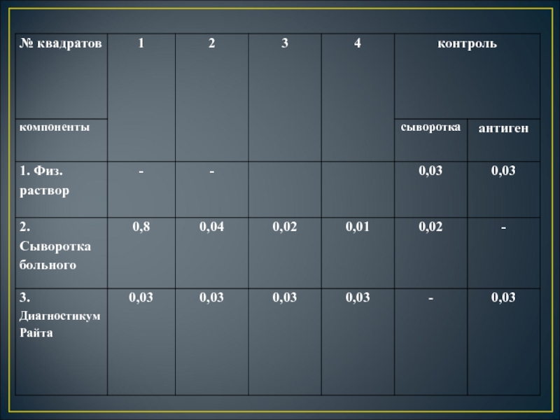 На 1-м квадрате с левой стороны записываю № испытуемой сыворотки, в последующие квадраты слева направо разливают испытуемую сыворотку в дозах данных в таблице.