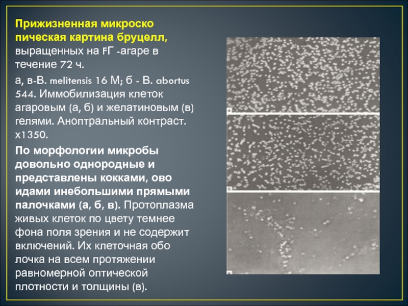 Слайд 8Прижизненная микроскопическая картина бруцелл, выращенных на FГ -агаре в течение