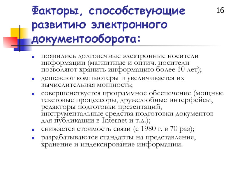 Слайд 16Факторы, способствующие развитию электронного документооборота: