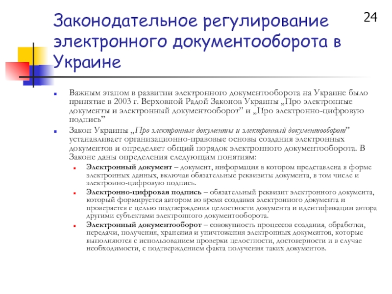 Слайд 24Законодательное регулирование электронного документооборота в Украине