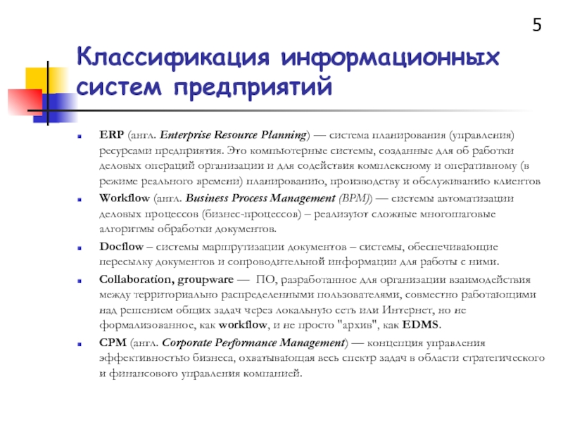 Слайд 5Классификация информационных систем предприятий