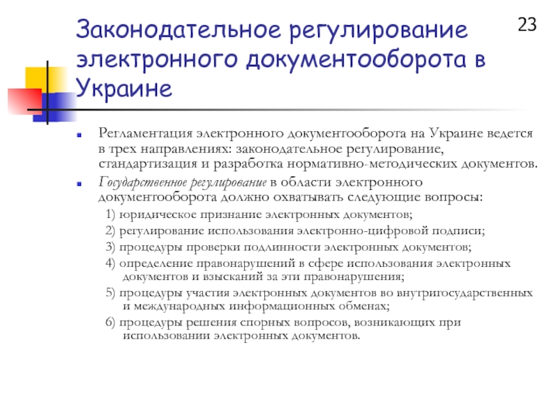Слайд 23Законодательное регулирование электронного документооборота в Украине