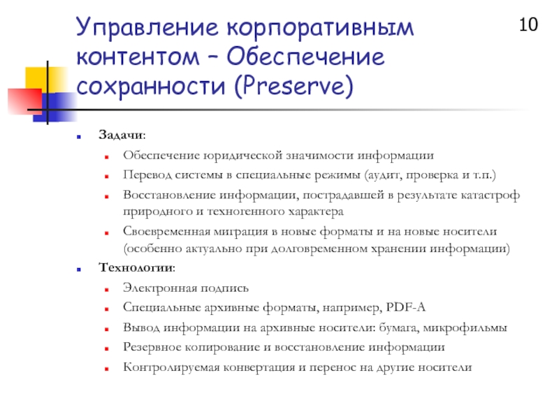 Слайд 10Управление корпоративным контентом – Обеспечение сохранности (Preserve)