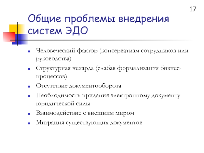 Слайд 17Общие проблемы внедрения систем ЭДО
