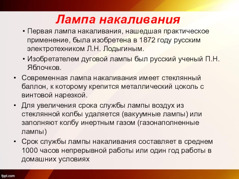 1872 году русским электротехником Л.Н. Лодыгиным.