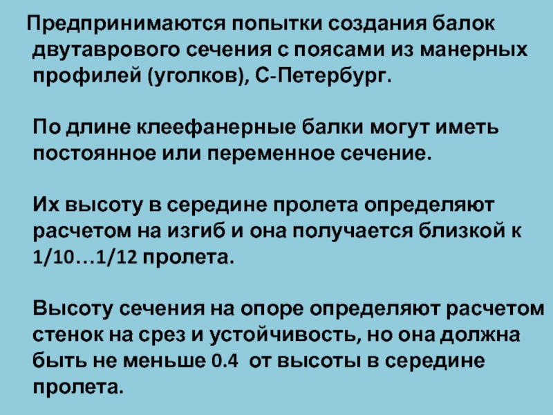 Слайд 43  Предпринимаются попытки создания балок двутаврового сечения с поясами