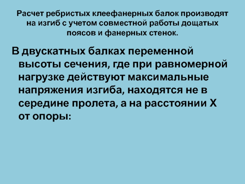 высоты сечения, где при равномерной нагрузке действуют максимальные напряжения изгиба, находятся не в середине пролета, а на расстоянии Х от опоры: