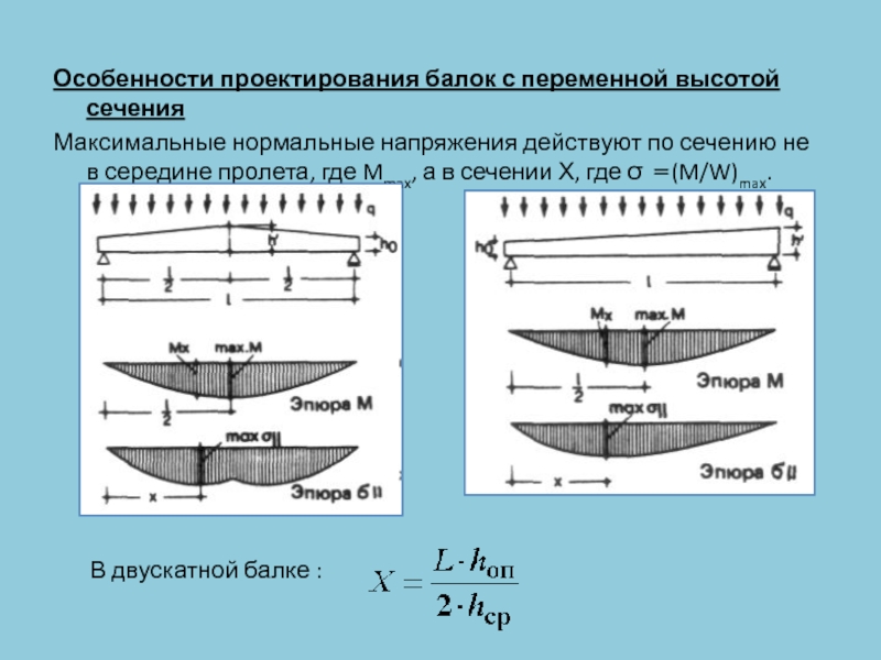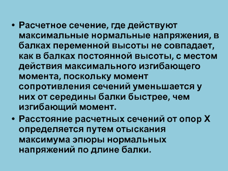 Слайд 20Расчетное сечение, где действуют максимальные нормальные напряжения, в балках переменной