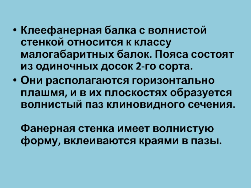 Слайд 62Клеефанерная балка с волнистой стенкой относится к классу малогабаритных балок.