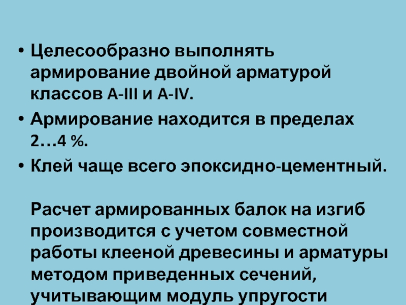 балок на изгиб производится с учетом совместной работы клееной древесины и арматуры методом приведенных сечений, учитывающим модуль упругости древесины и стали.
