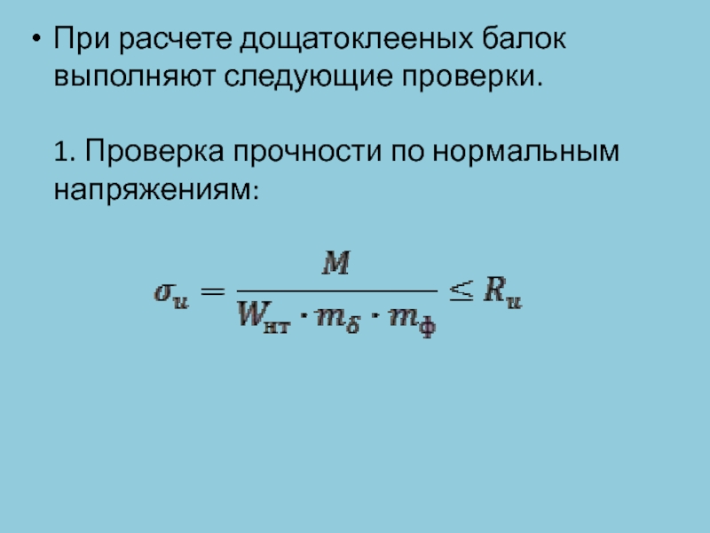 Слайд 18При расчете дощатоклееных балок выполняют следующие проверки.