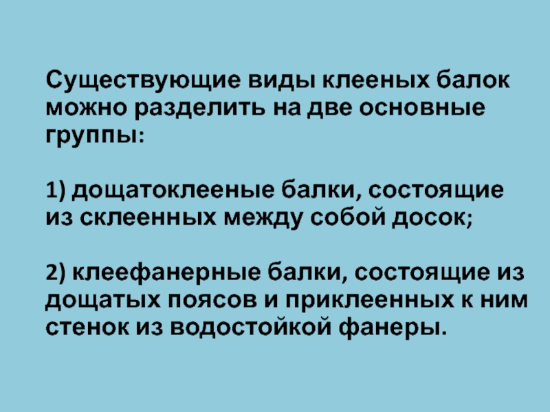 Слайд 3  Существующие виды клееных балок можно разделить на две
