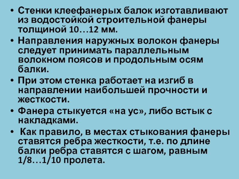 Слайд 44Стенки клеефанерых балок изготавливают из водостойкой строительной фанеры толщиной 10…12