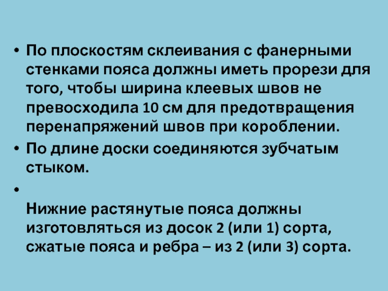 Слайд 46По плоскостям склеивания с фанерными стенками пояса должны иметь прорези