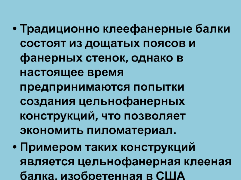 Примером таких конструкций является цельнофанерная клееная балка, изобретенная в США