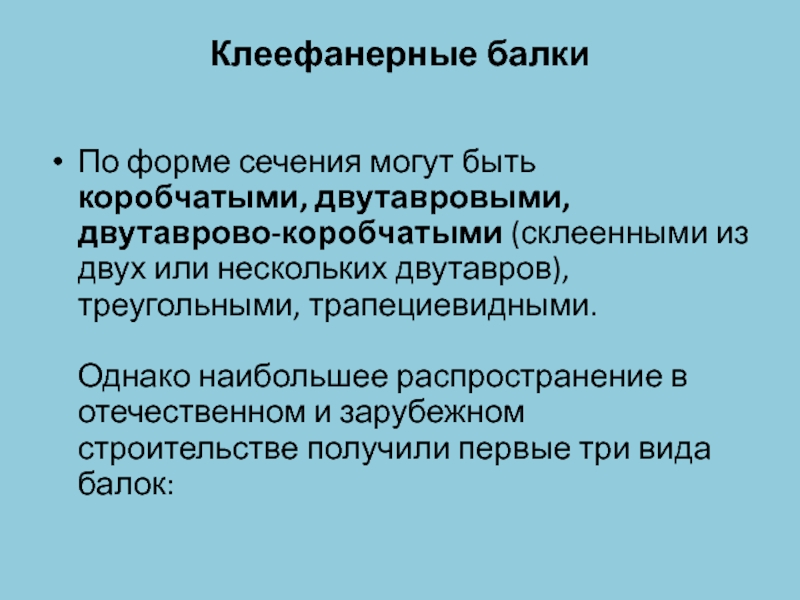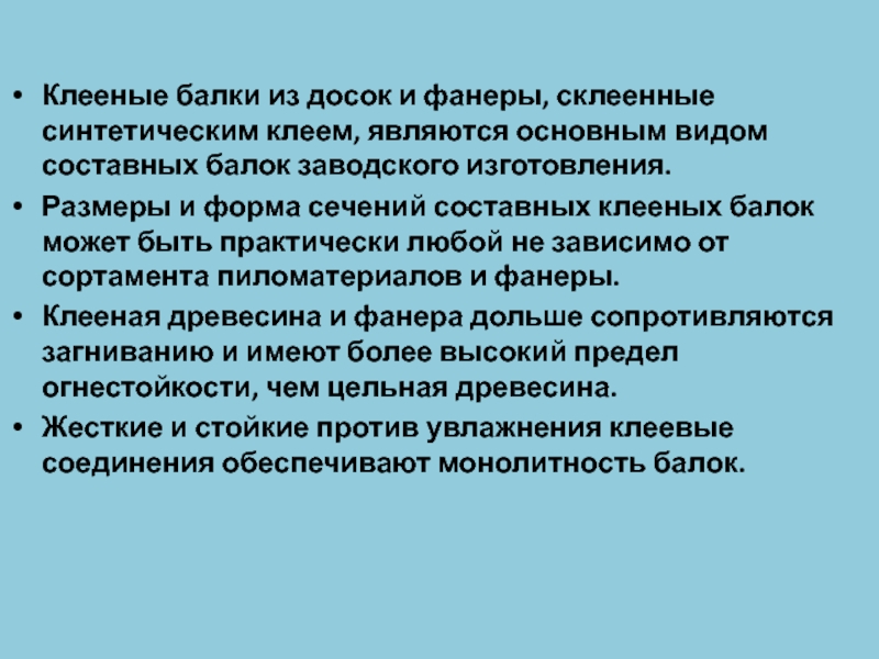 Слайд 2Клееные балки из досок и фанеры, склеенные синтетическим клеем, являются