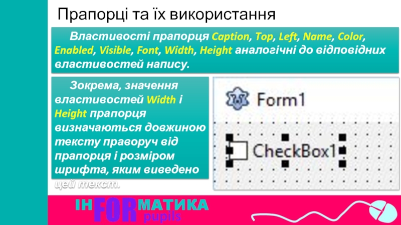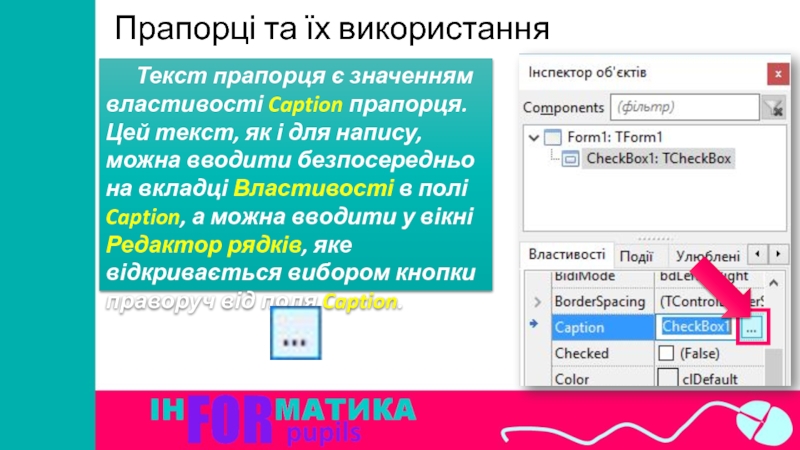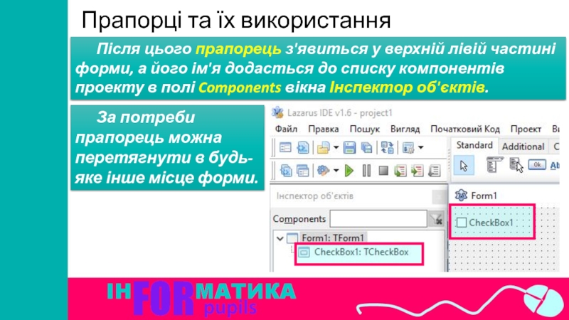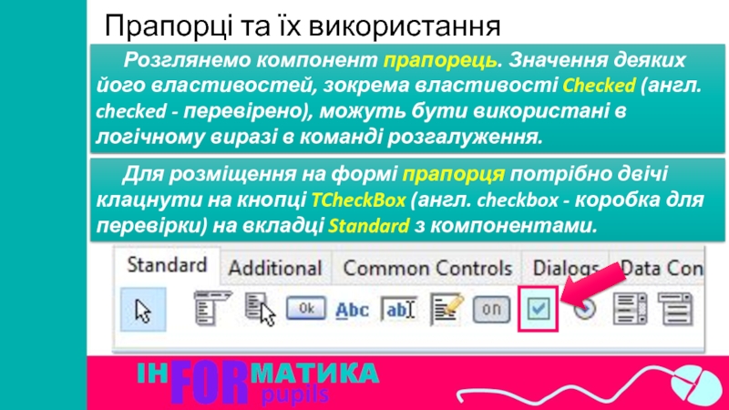 Для розміщення на формі прапорця потрібно двічі клацнути на кнопці TCheckBox (англ. checkbox - коробка для перевірки) на вкладці Standard з компонентами.
