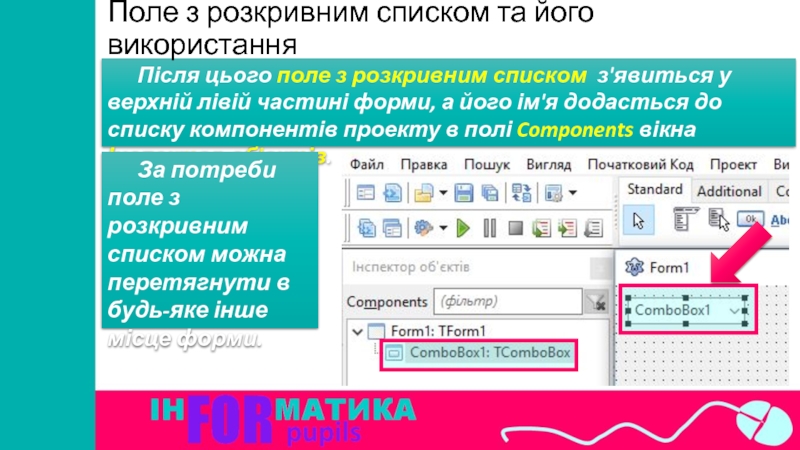Для розміщення на формі поля з розкривним списком потрібно двічі клацнути на кнопці TComboBox (англ. combobox - поле зі списком) на вкладці Standard з компонентами.