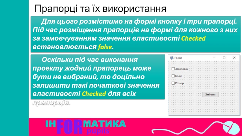 Оскільки під час виконання проекту жодний прапорець може бути не вибраний, то доцільно залишити такі початкові значення властивості Checked для всіх прапорців.