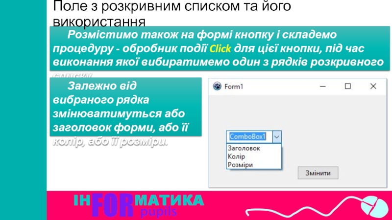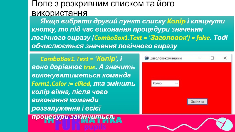 ComboBox1.Text = 'Колір', і воно дорівнює true. А значить виконуватиметься команда Form1.Color := clRed, яка змінить колір вікна, після чого виконання команди розгалуження і всієї процедури закінчиться.