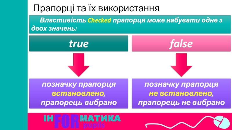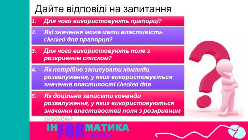 Для чого використовувалися в програмах, з якими ви працювали, прапорці, поля з розкривними списками, перемикачі?