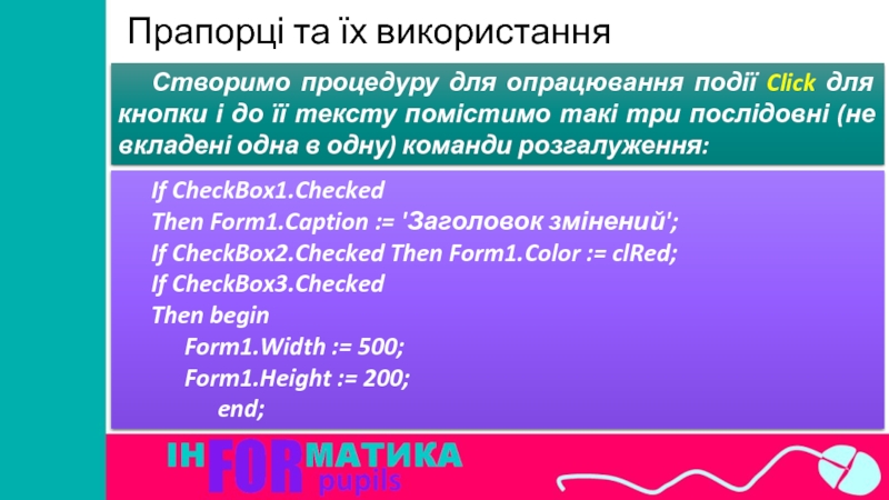 Form1.Caption := 'Заголовок змінений', яка змінить заголовок вікна, після чого виконання команди розгалуження і всієї процедури закінчиться.