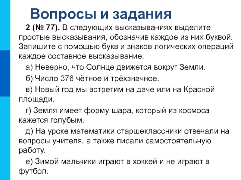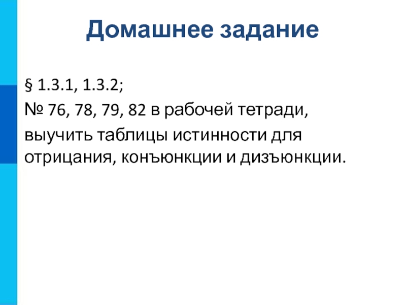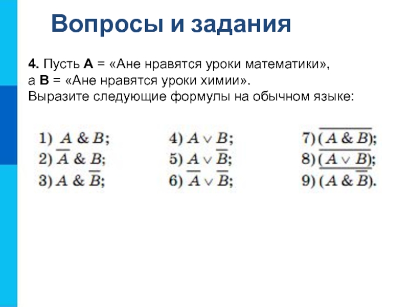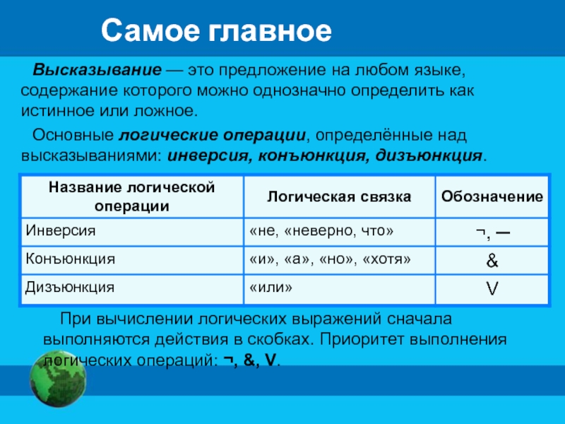 При вычислении логических выражений сначала выполняются действия в скобках. Приоритет выполнения логических операций: ¬, &, V.