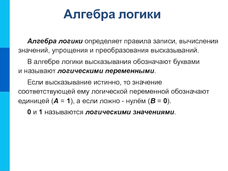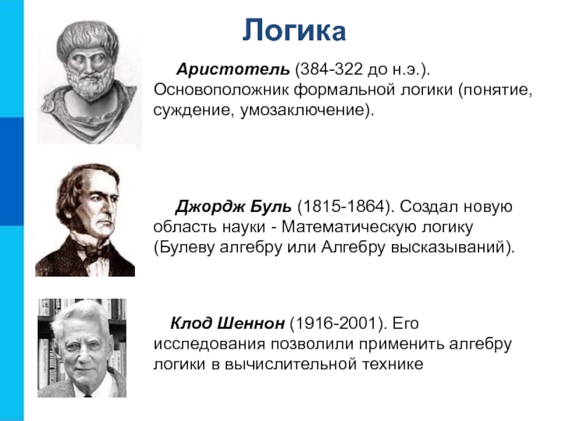 Джордж Буль (1815-1864). Создал новую область науки - Математическую логику (Булеву алгебру или Алгебру высказываний).