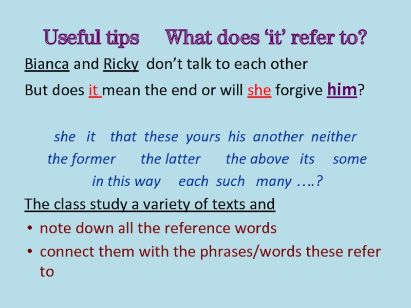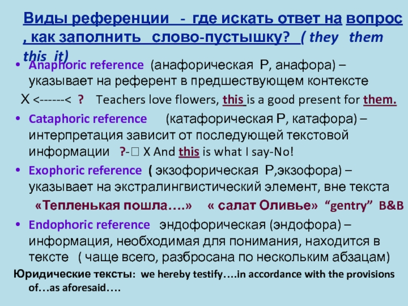 Endophoric reference эндофорическая (эндофора) – информация, необходимая для понимания, находится в тексте ( чаще всего, разбросана по нескольким абзацам)