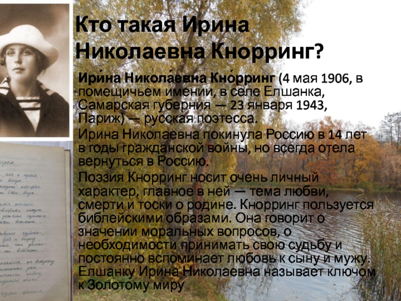 Кто такая Ирина Николаевна Кнорринг?Ири́на Никола́евна Кно́рринг (4 мая 1906, в помещичьем имении, в селе Елшанка, Самарская