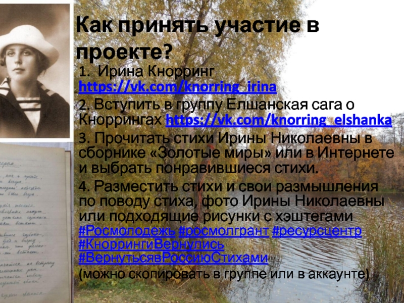 Как принять участие в проекте?1. Ирина Кнорринг https://vk.com/knorring_irina 2. Вступить в группу Елшанская сага о Кноррингах https://vk.com/knorring_elshanka3.