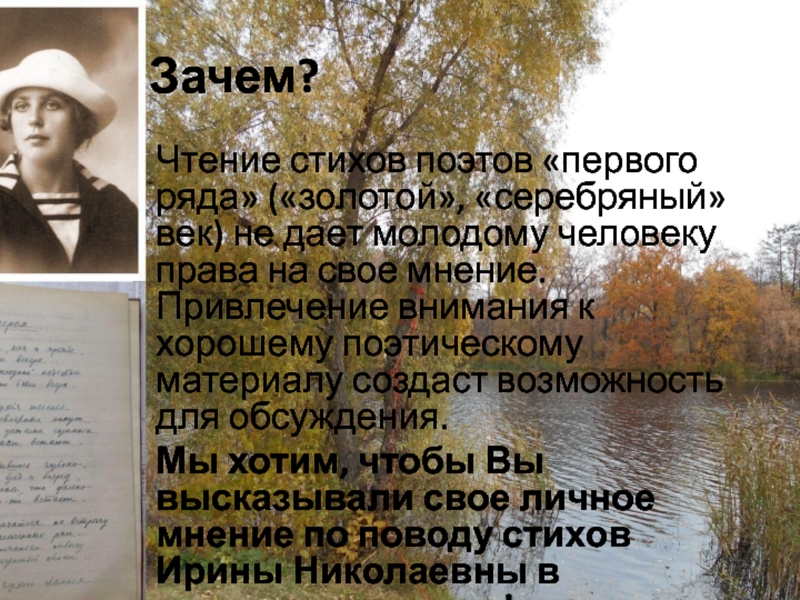 Зачем?Чтение стихов поэтов «первого ряда» («золотой», «серебряный» век) не дает молодому человеку права на свое мнение. Привлечение