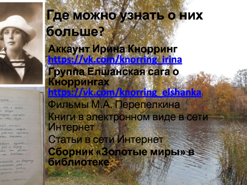 Где можно узнать о них больше?Аккаунт Ирина Кнорринг https://vk.com/knorring_irina Группа Елшанская сага о Кноррингах https://vk.com/knorring_elshankaФильмы М.А. ПерепелкинаКниги