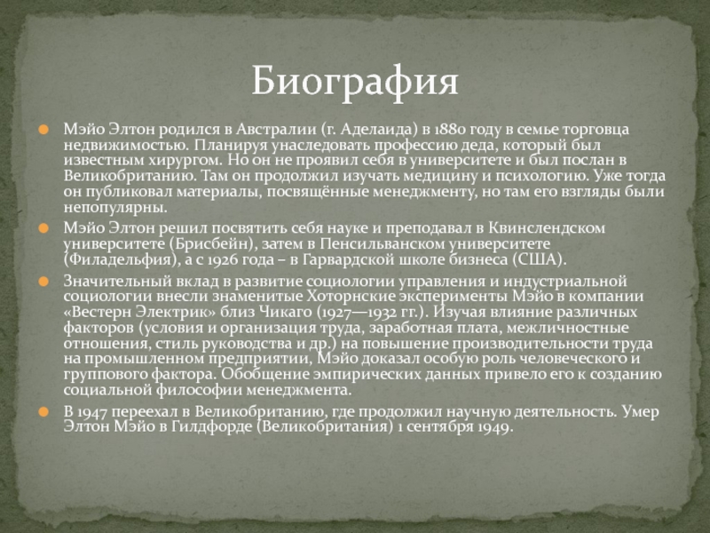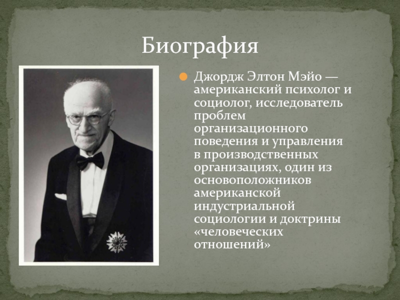 Работа «Человеческие проблемы индустриальной цивилизации» содержит официальный отчет о хоторнских экспериментах. Работа начинается с предостережения, что в управлении нет скорых решений, как и простых универсальных ответов «в промышленности, как и в медицине, тот, кто ищет простое средство от всех болезней, обречен на неудачу».
