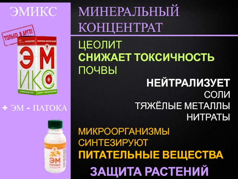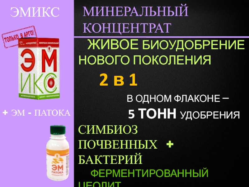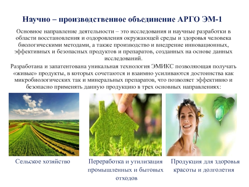 Разработана и запатентована уникальная технология ЭМИКС позволяющая получать «живые» продукты, в которых сочетаются и взаимно усиливаются достоинства как микробиологических так и минеральных препаратов, что позволяет эффективно и безопасно применять данную продукцию в трех основных направлениях: