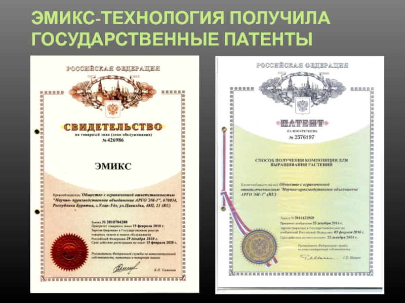 Слайд 8ЭМИКС-ТЕХНОЛОГИЯ ПОЛУЧИЛА ГОСУДАРСТВЕННЫЕ ПАТЕНТЫ
