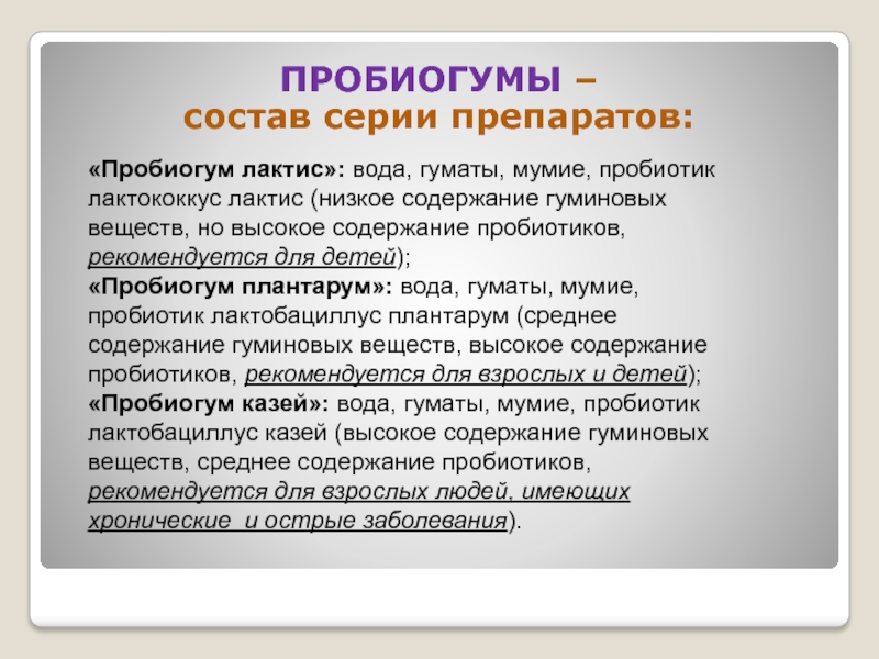 «Пробиогум казей»: вода, гуматы, мумие, пробиотик лактобациллус казей (высокое содержание гуминовых веществ, среднее содержание пробиотиков, рекомендуется для взрослых людей, имеющих хронические и острые заболевания).