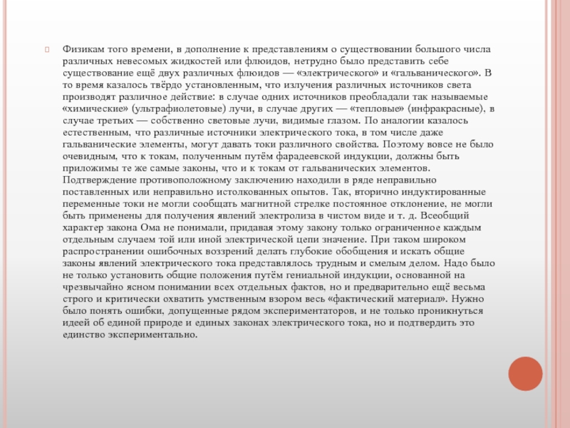 существование ещё двух различных флюидов — «электрического» и «гальванического». В то время казалось твёрдо установленным, что излучения различных источников света производят различное действие: в случае одних источников преобладали так называемые «химические» (ультрафиолетовые) лучи, в случае других — «тепловые» (инфракрасные), в случае третьих — собственно световые лучи, видимые глазом. По аналогии казалось естественным, что различные источники электрического тока, в том числе даже гальванические элементы, могут давать токи различного свойства. Поэтому вовсе не было очевидным, что к токам, полученным путём фарадеевской индукции, должны быть приложимы те же самые законы, что и к токам от гальванических элементов. Подтверждение противоположному заключению находили в ряде неправильно поставленных или неправильно истолкованных опытов. Так, вторично индуктированные переменные токи не могли сообщать магнитной стрелке постоянное отклонение, не могли быть применены для получения явлений электролиза в чистом виде и т. д. Всеобщий характер закона Ома не понимали, придавая этому закону только ограниченное каждым отдельным случаем той или иной электрической цепи значение. При таком широком распространении ошибочных воззрений делать глубокие обобщения и искать общие законы явлений электрического тока представлялось трудным и смелым делом. Надо было не только установить общие положения путём гениальной индукции, основанной на чрезвычайно ясном понимании всех отдельных фактов, но и предварительно ещё весьма строго и критически охватить умственным взором весь «фактический материал». Нужно было понять ошибки, допущенные рядом экспериментаторов, и не только проникнуться идеей об единой природе и единых законах электрического тока, но и подтвердить это единство экспериментально.