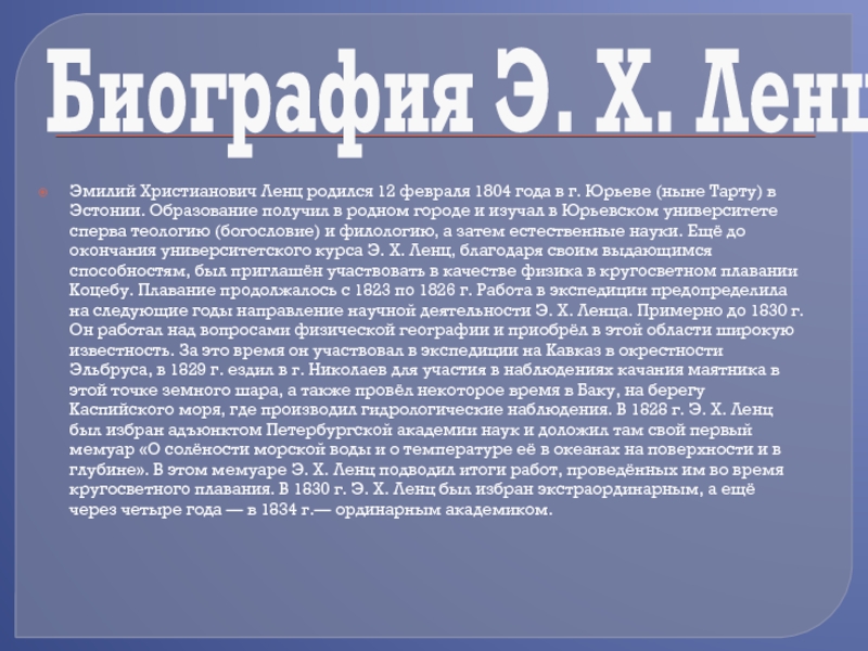 в родном городе и изучал в Юрьевском университете сперва теологию (богословие) и филологию, а затем естественные науки. Ещё до окончания университетского курса Э. X. Ленц, благодаря своим выдающимся способностям, был приглашён участвовать в качестве физика в кругосветном плавании Коцебу. Плавание продолжалось с 1823 по 1826 г. Работа в экспедиции предопределила на следующие годы направление научной деятельности Э. X. Ленца. Примерно до 1830 г. Он работал над вопросами физической географии и приобрёл в этой области широкую известность. За это время он участвовал в экспедиции на Кавказ в окрестности Эльбруса, в 1829 г. ездил в г. Николаев для участия в наблюдениях качания маятника в этой точке земного шара, а также провёл некоторое время в Баку, на берегу Каспийского моря, где производил гидрологические наблюдения. В 1828 г. Э. X. Ленц был избран адъюнктом Петербургской академии наук и доложил там свой первый мемуар «О солёности морской воды и о температуре её в океанах на поверхности и в глубине». В этом мемуаре Э. X. Ленц подводил итоги работ, проведённых им во время кругосветного плавания. В 1830 г. Э. X. Ленц был избран экстраординарным, а ещё через четыре года — в 1834 г.— ординарным академиком.