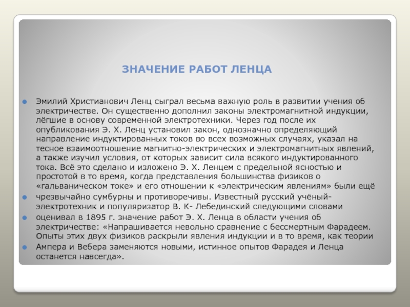 лёгшие в основу современной электротехники. Через год после их опубликования Э. X. Ленц установил закон, однозначно определяющий направление индуктированных токов во всех возможных случаях, указал на тесное взаимоотношение магнитно-электрических и электромагнитных явлений, а также изучил условия, от которых зависит сила всякого индуктированного тока. Всё это сделано и изложено Э. X. Ленцем с предельной ясностью и простотой в то время, когда представления большинства физиков о «гальваническом токе» и его отношении к «электрическим явлениям» были ещё