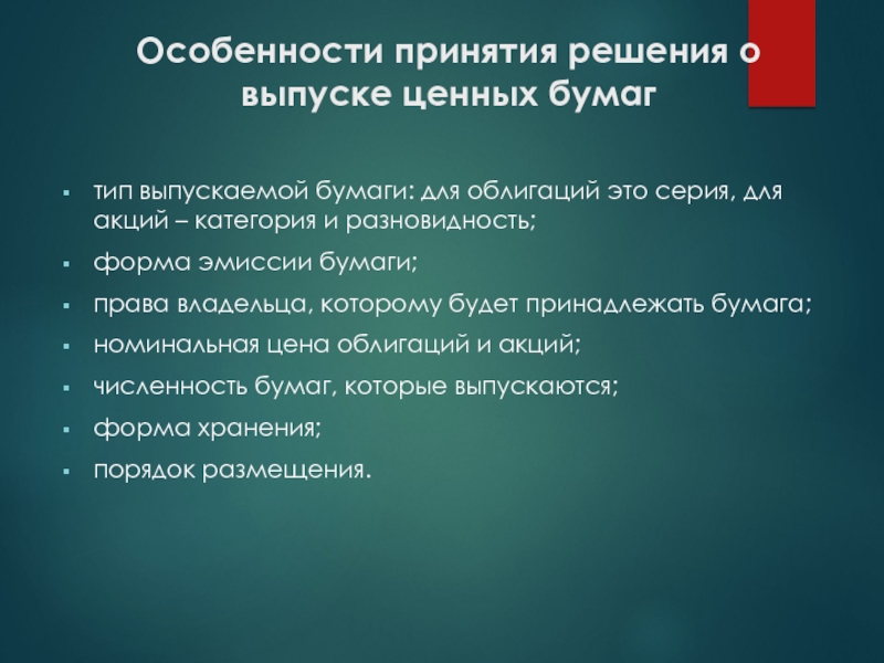 Слайд 12Особенности принятия решения о выпуске ценных бумаг