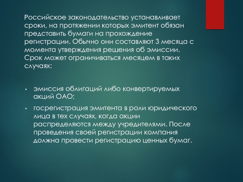 Российское законодательство устанавливает сроки, на протяжении которых эмитент обязан представить бумаги на прохождение регистрации. Обычно они составляют