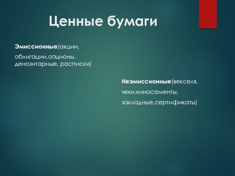 Ценные бумагиЭмиссионные(акции,облигации,опционы, денозитарные, расписки)Неэмиссионные(векселя,чеки,киносаменты,закладные,сертификаты)