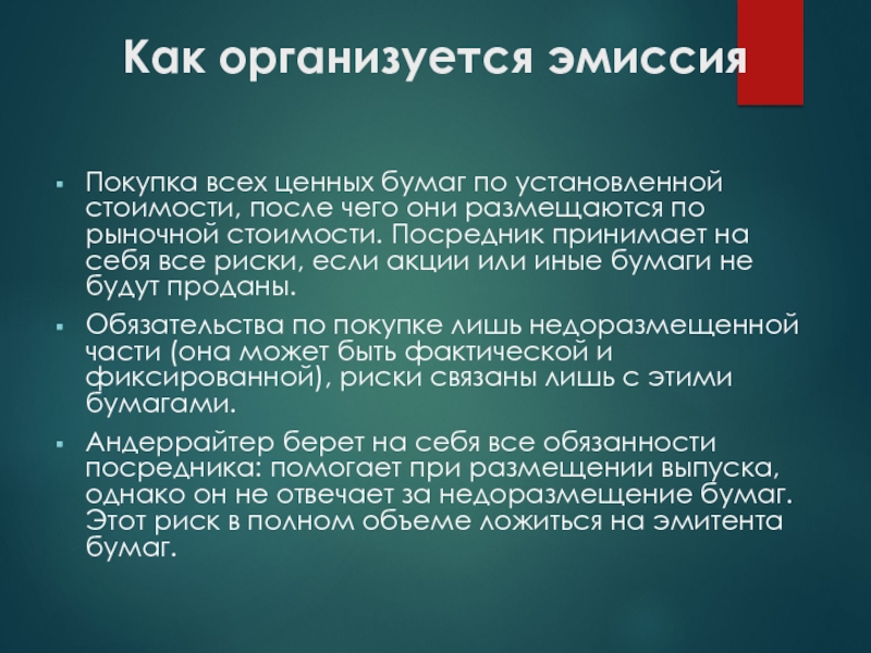 Как организуется эмиссия Покупка всех ценных бумаг по установленной стоимости, после чего они размещаются по рыночной стоимости.