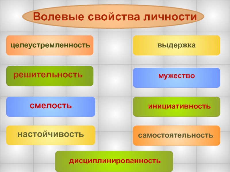 Волевые свойства личностирешительностьцелеустремленностьсмелостьнастойчивостьвыдержкамужествоинициативностьсамостоятельностьдисциплинированность