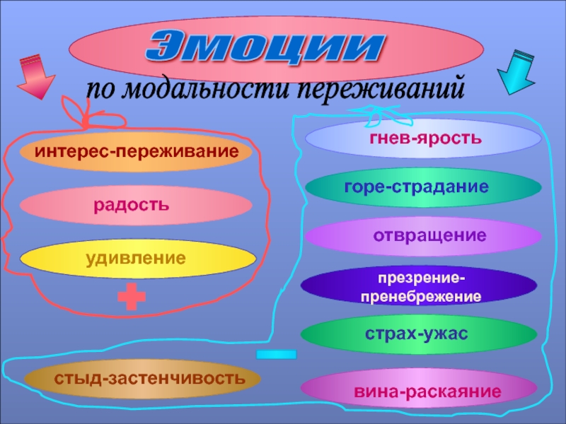 Эмоциипо модальности переживанийинтерес-переживаниерадостьудивлениегоре-страданиеотвращениегнев-яростьпрезрение-пренебрежениестрах-ужасстыд-застенчивостьвина-раскаяние