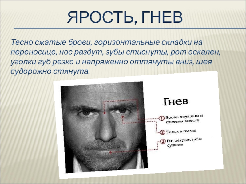ЯРОСТЬ, ГНЕВ Тесно сжатые брови, горизонтальные складки на переносице, нос раздут, зубы стиснуты, рот оскален, уголки губ